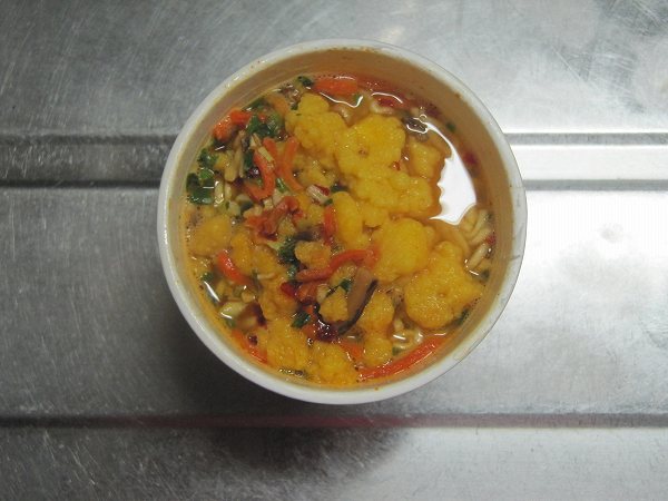 お湯を入れて3分、蓋を開けてよくかき混ぜれば完成。魚介とシイタケの合わさったとても良い香りが漂ってくるとともに、彩り豊かな具材がタップリと入っています。