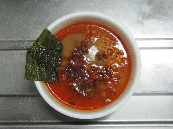 早速、スープを一口いただきます。豚骨エキスが効いているような気がしますが、とにかく唐辛子の辛みの方が先行してくるので、その正体が解らないといった感じです。