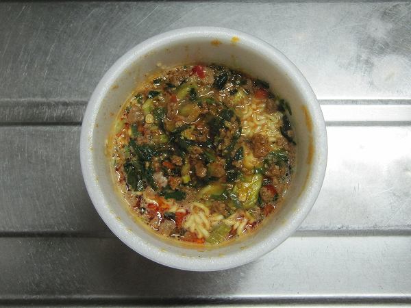 お湯を入れて3分、蓋を開けて粉末スープを入れてよくかき混ぜれば完成。少し酸味があるような香りがしてくるのですが、担担麺ならではのゴマの風味が足りないです。