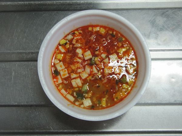 お湯を入れて3分、蓋を開けて仕上げの小袋を入れてよくかき混ぜれば完成。ゴマの香りとともに書いてあるとおり花椒の香りもしてくる本格的なものとなっています。