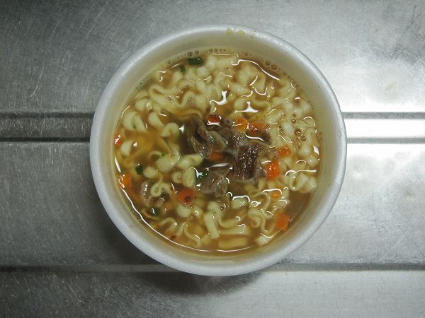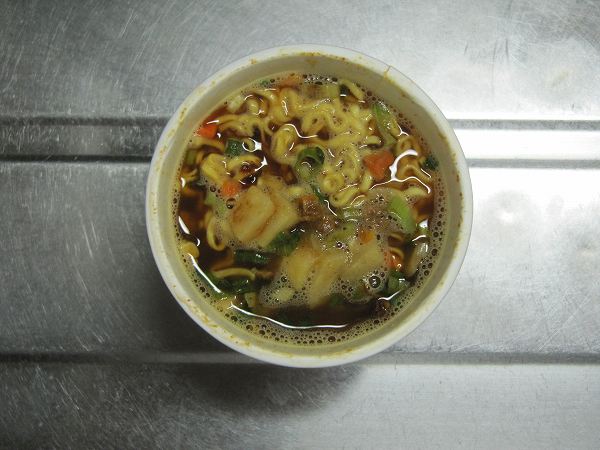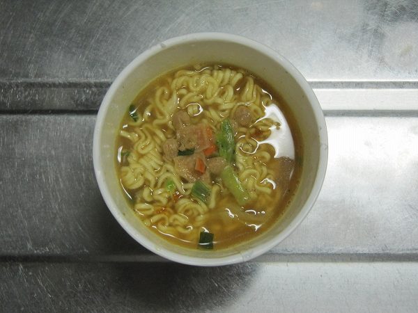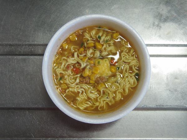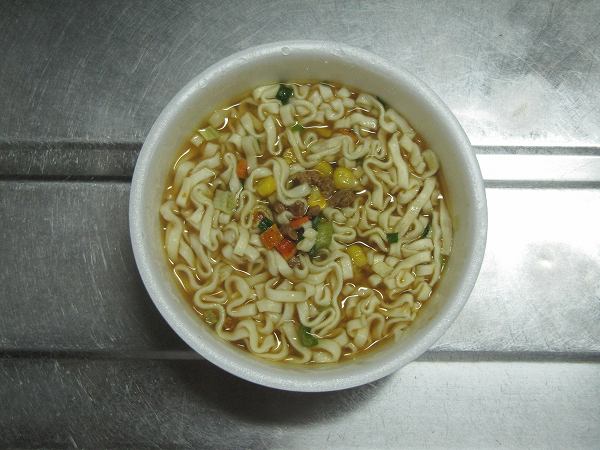 お湯を入れて5分、蓋を開けて粉末スープを入れてよくかき混ぜれば完成。どちらかといえばスパイシーなカレー風味が漂ってくるとともに彩りの良い具材が現れました。