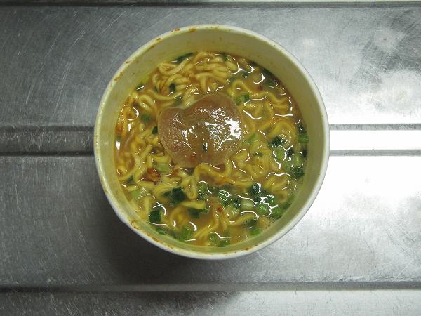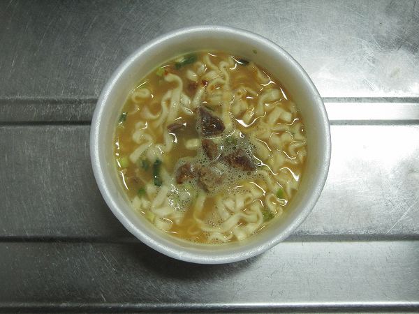 お湯を入れて麺を良くほぐしてから一旦お湯を捨てます。蓋を剥がして粉末スープと液体スープを入れてよくかき混ぜれば完成。食欲をそそる良い香りがしてきました。