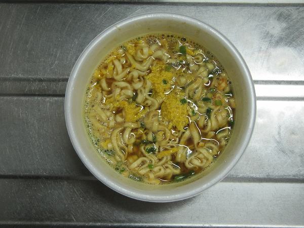 お湯を入れて5分、蓋を開けて調味油を入れてよくかき混ぜれば完成。和風だしのとても良い香りとともに、かき卵の甘そうな香りがしてきて食欲をそそられました。