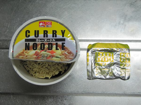 お湯を入れて3分、蓋を開けて液体スープを入れてよくかき混ぜれば完成。液体スープを入れた瞬間に豚骨の風味が漂ってきましたが直ぐにカレーの風味に変わりました。