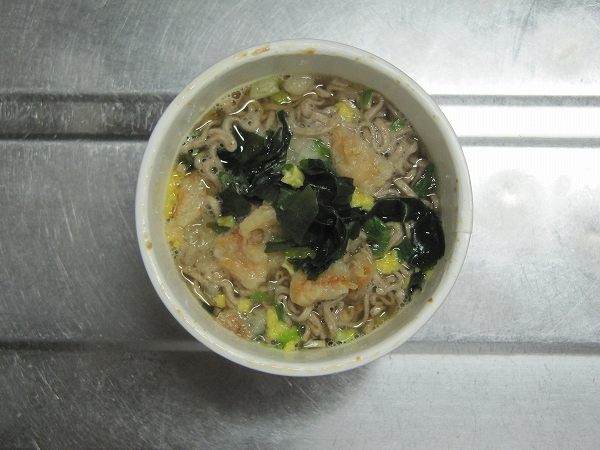 お湯を入れて5分といったそばにしては長めの湯戻し時間。蓋を開けてよくかき混ぜてから鼻を近づけてみたのですが、やっと解るくらいの蕎麦の香りがしてきました。