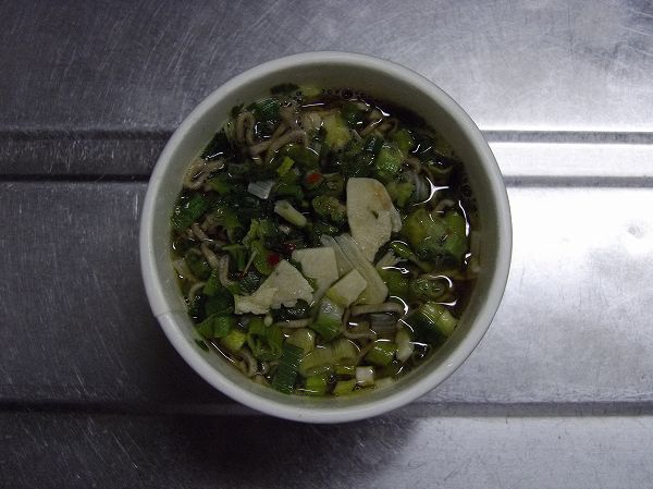 お湯を入れて3分、蓋を開けてよくかき混ぜれば完成。書いてあったとおりに鰹節のとても良い香りが漂ってくるとともに、たっぷりと長ネギが入っているのが解ります。