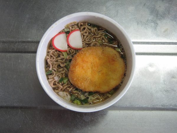 以前にどんぶり型のほくほくのコロッケそばというのが登場し、具材のコロッケに衝撃を受けたのですが、今回は縦型カップになってほくほくとしたとなりました。