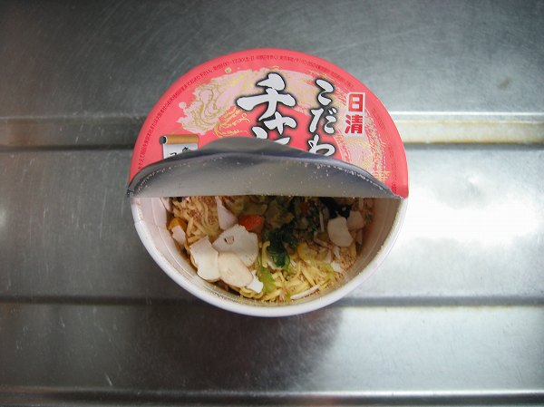 3分後に蓋を開けると肉系のスープの香りがしてきました。なんとなく塩ラーメンっぽいような感じですね。