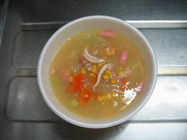 具はキャベツ、ニンジン、キクラゲ、コーン、カマボコ、イカの6種類。盛りだくさんです。