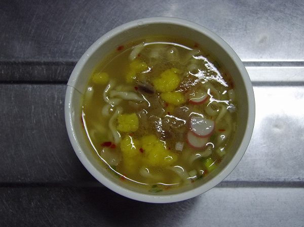 お湯を入れて5分、蓋を開けて液体スープを入れてよくかき混ぜれば完成。鰹だしだけではなく豚のとても良い香りが漂ってくるとともに、澄んだスープが現れました。