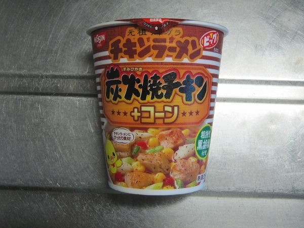 以前に炭火焼チキンビッグというのが登場してチキンラーメンの旨みと風味の良さと炭火で焼いた鶏肉の合わせ技を楽しめたのですが、今回はコーンが加わりました。