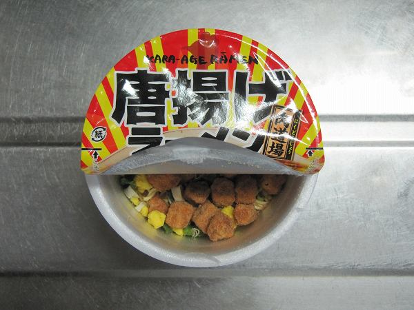 お湯を入れて3分、蓋を開けてよくかき混ぜれば完成。ジューシーそうな唐揚げの香りそのままの風味がしっかりと漂ってくるので、スープの香りが負けている感じです。