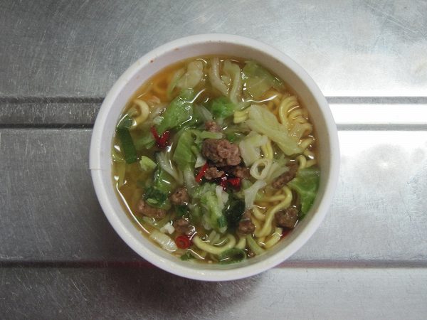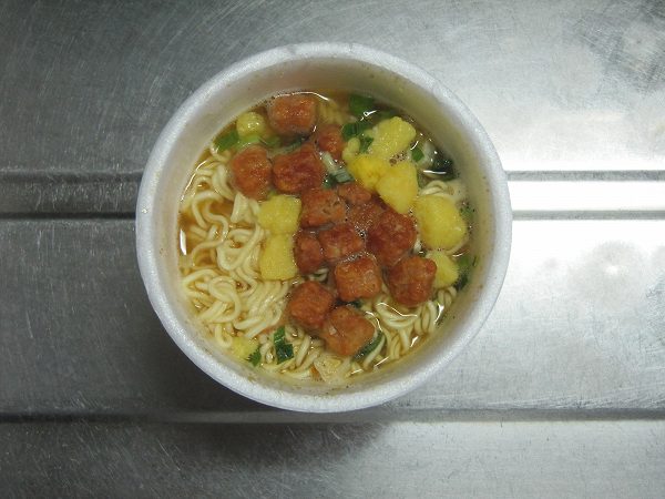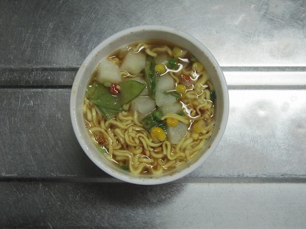 麺はスナック麺タイプとなっているので少し柔らかめとなっていますが、サクサクとした食感が残っているのと麺自体に味付けがなされているので美味しくいただけます。