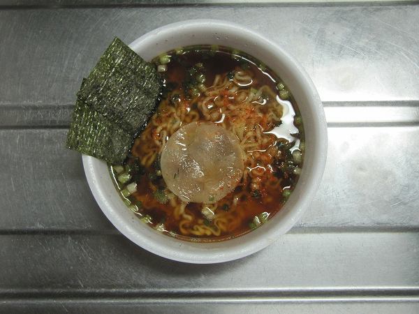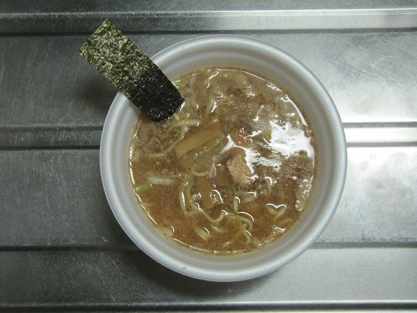 お湯を入れて4分、蓋を開けて特製スープを入れてよくかき混ぜ、レトルト具材を載せてさらにかき混ぜ、最後に焼き海苔を添えれば完成。豚骨の良い風味が漂いました。
