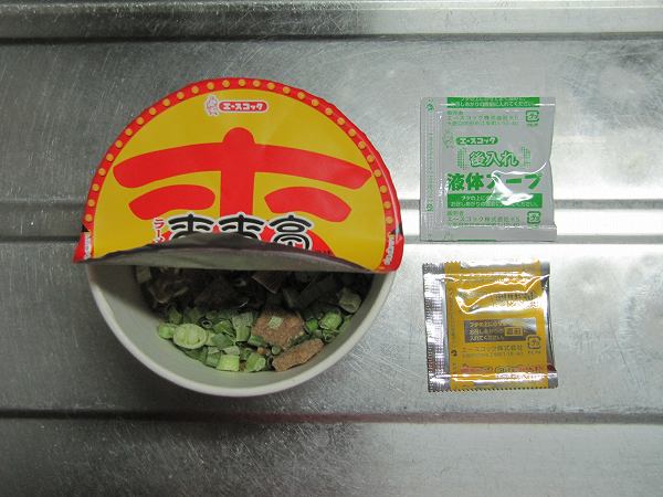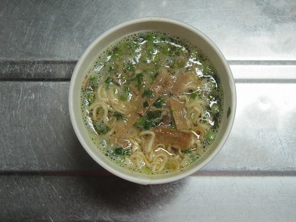 お湯を入れて5分、粉末スープと液体スープを入れてよくかき混ぜれば完成。鶏ガラの良い香りが漂ってくるとともに背脂と長ネギの香りもしてきて食欲がそそられます。