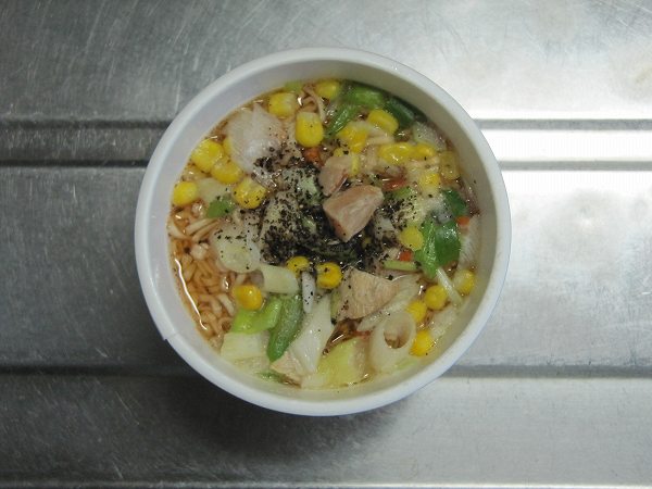 お湯を入れて3分、蓋を開けて粗挽き黒胡椒をかければ完成。いつもと変わることのないチキンラーメンならではの風味が漂ってくるとともに黒胡椒の風味もあります。