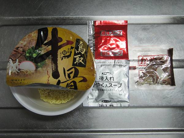 といった鳥取ラーメンの良いところを紹介する文章を読んでからお湯を入れて4分、蓋を開けて液体スープと後入れかやく入りスープを入れてよくかき混ぜれば完成です。