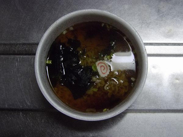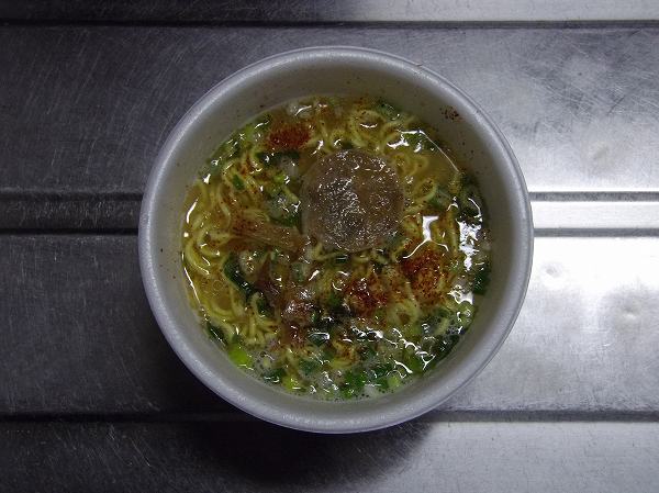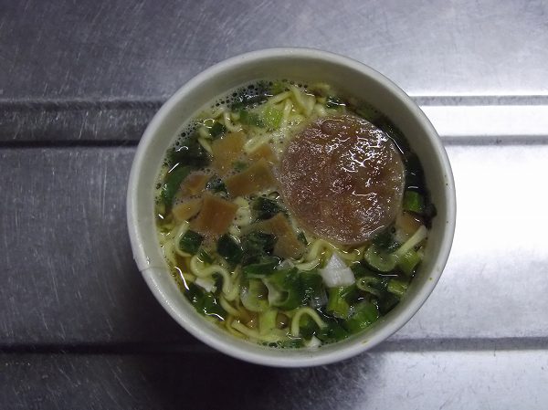 お湯を入れて4分、蓋を開けてかやく入り粉末スープと液体スープを入れてよくかき混ぜれば完成。何か懐かしさを感じるチキンエキスとほのかな魚介の香りがしました。