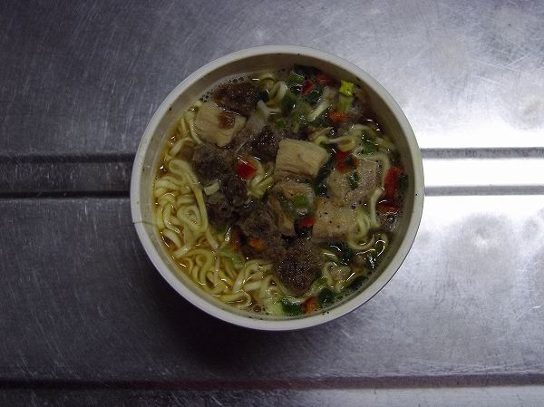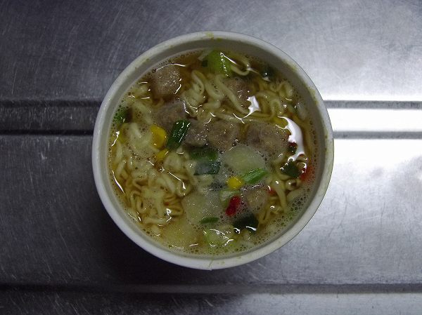 お湯を入れて3分、蓋を開けてよくかき混ぜれば完成。チキンとポークが利いているのがよく解るとても良い香りがしてくるとともに、ゴロッとした肉が現れました。