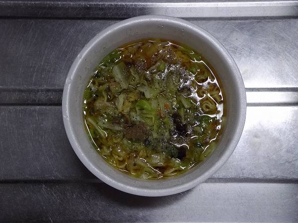 お湯を入れて4分、蓋を開けてよくかき混ぜれば完成。コストを下げるために具とスープをひとつの袋に入れてあり、チキンエキスと麺が一緒になった香りがしました。