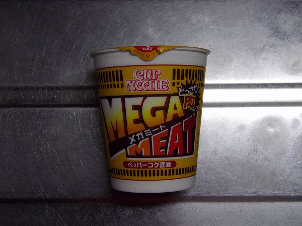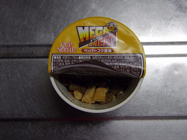 今回はどっさりと肉が入っているメガミートペッパーコク醤油ということで、カップヌードルレギュラーサイズ史上最大の「肉」重量となっていますがどんな感じなのか。
