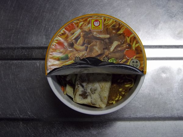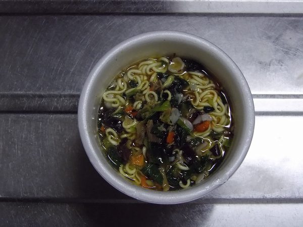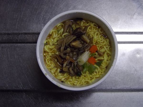 お湯を入れて3分、蓋を開けてよくかき混ぜれば完成。定番の醤油ラーメンのスープの香りだけではなく、シイタケをはじめとしたきのこの良い香りもしてくる感じです。