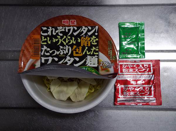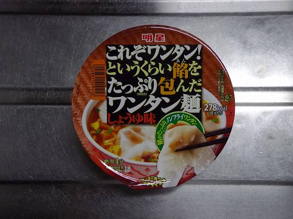 モチモチのワンタンを得意としている明星から、見ただけで特徴が解るカップ麺の登場。これぞワンタン!というくらい餡をたっぷり包んだワンタン麺のしょうゆ味です。