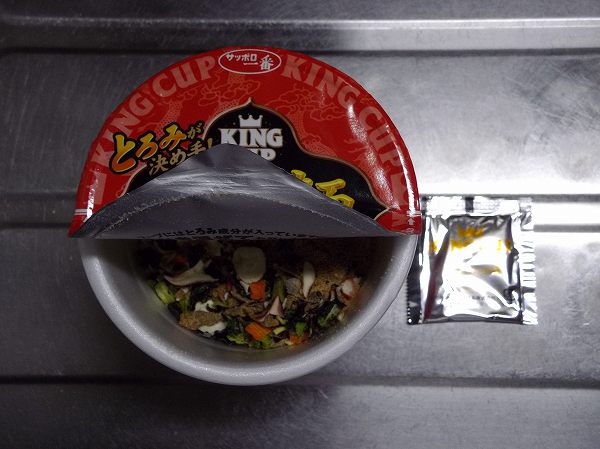 お湯を入れて3分、蓋を開けてよくかき混ぜれば完成。ニンニクと醤油と油揚げ麺の香りが合わさっているのがよく伝わってくるとともに、彩り豊かな具材が現れました。