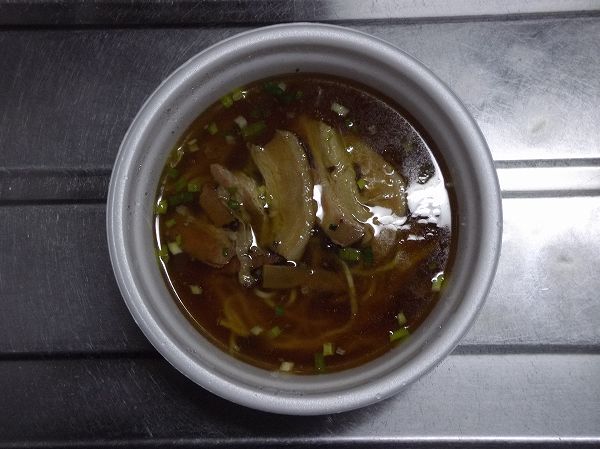 早速、スープを一口いただきます。とろみがあるので舌をコーティングしてくるような感じで、醤油味がしっかりとしていて、シイタケの隠し味が利いている味わいです。