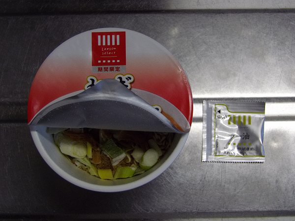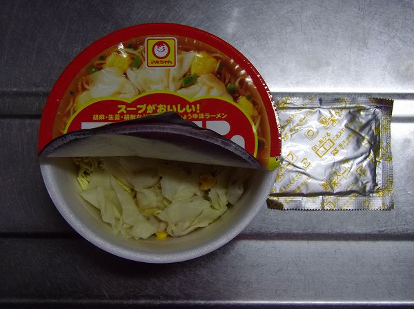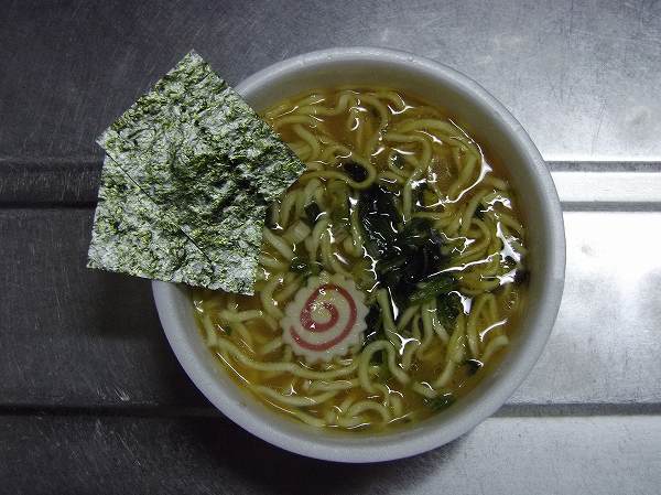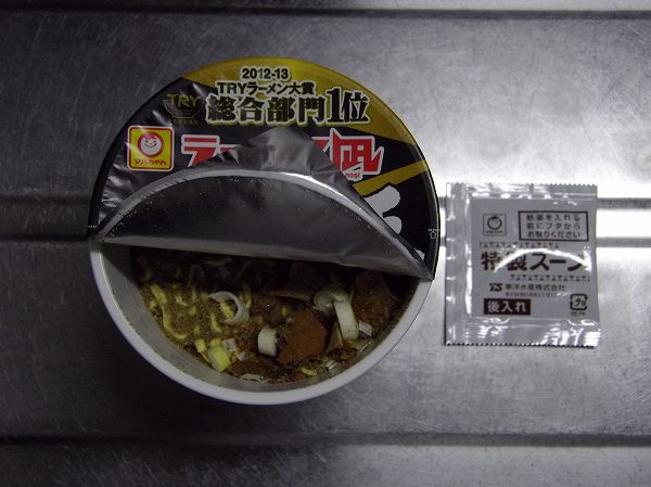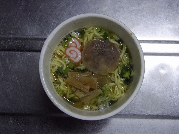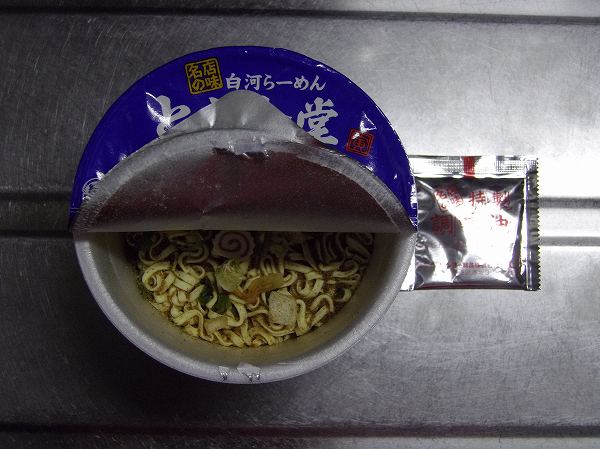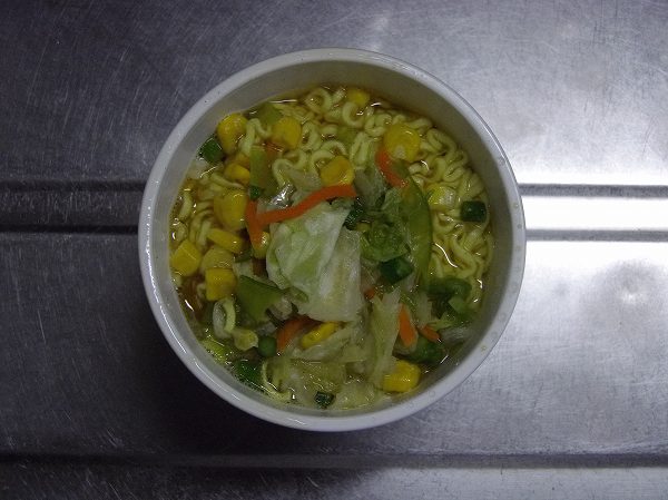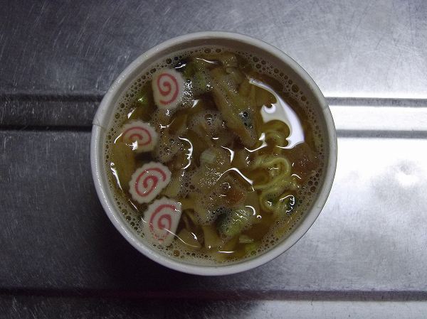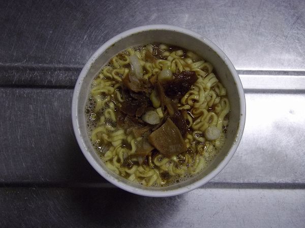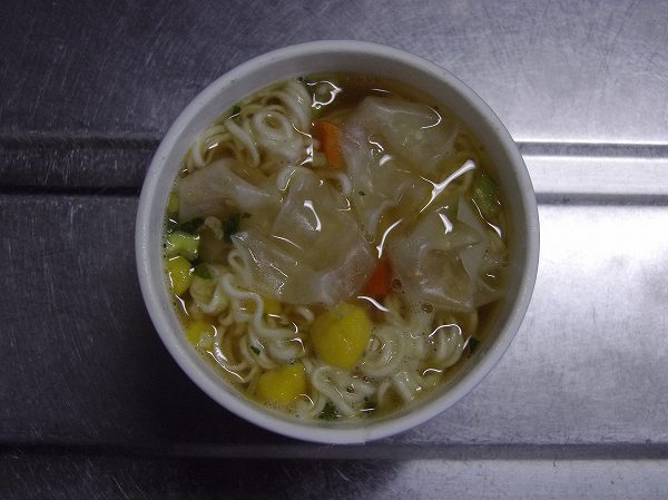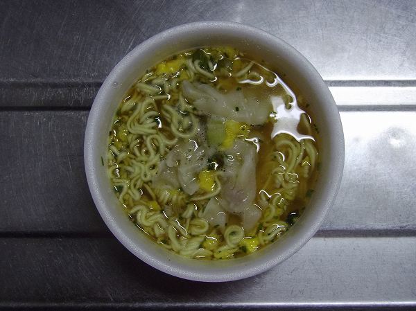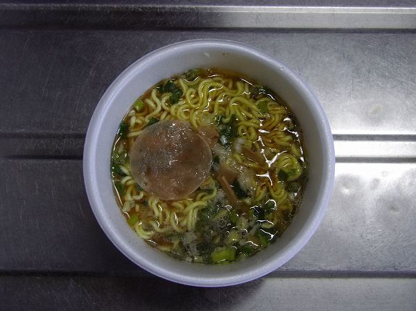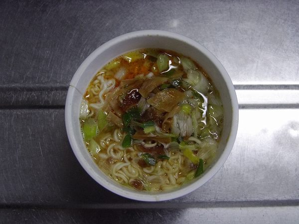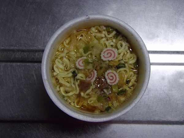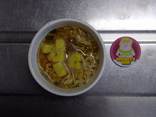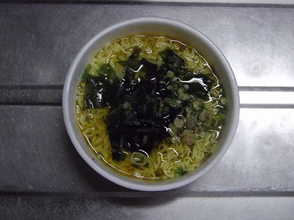 お湯を入れて3分、蓋を開けて粉末スープを入れてよくかき混ぜれば完成。何か懐かしさを感じる油揚げ麺の香りとともに心落ち着くようなスープの香りがしてきました。