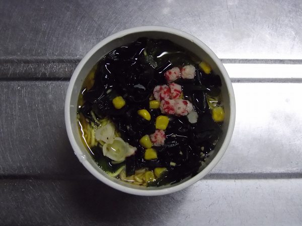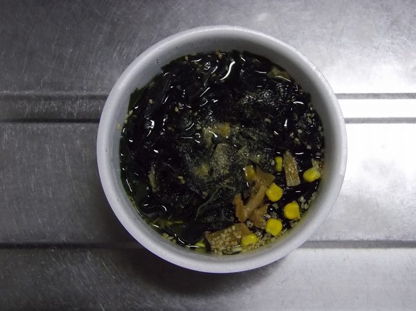 お湯を入れて3分、蓋を開けて液体スープを入れてよくかき混ぜれば完成。鼻を近づけるとやっとわかるくらいの魚介の風味がしてくるとともにわかめの香りもしました。