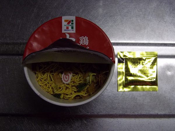 お湯を入れて3分、蓋を開けて液体スープを入れてよくかき混ぜれば完成。スープを入れた瞬間に鶏の香りが強かったのですが、かき混ぜると魚介の風味もしてきました。