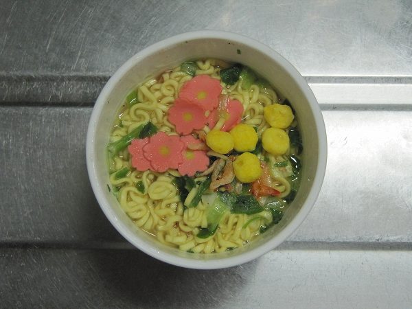 お湯を入れて3分、蓋を開けてよくかき混ぜれば完成。桜えびの風味がしっかりと漂ってくるとともに、麺に含まれている卵の香りもしてくるので不思議な気がします。