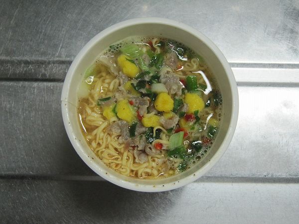 お湯を入れて5分、蓋を開けて粉末スープと液体スープを入れてよくかき混ぜてから、別途温めていたレトルト具材を乗せて、最後にあとのせかやくを入れたら完成です。