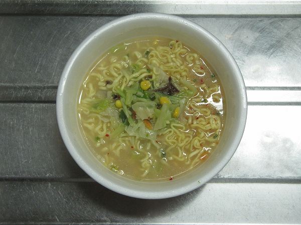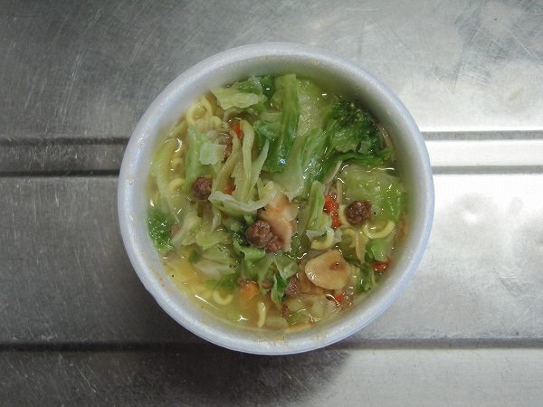 お湯を入れて3分、蓋を開けて仕上げの小袋を入れてよくかき混ぜれば完成。これでもかというくらいのニンニクの香りが漂い、たっぷりの野菜が目の前に現れました。