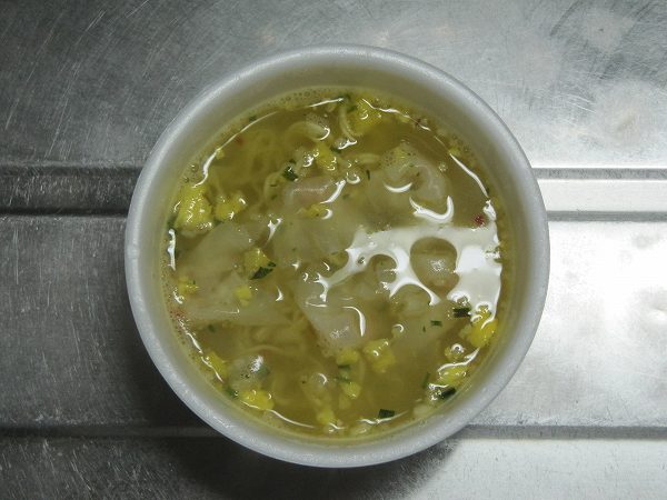 お湯を入れて5分、蓋を開けて液体スープを入れてよくかき混ぜれば完成。ポークと香辛料の合わさったとても良い香りがしてくるだけでなく魚介の香りもしてきました。
