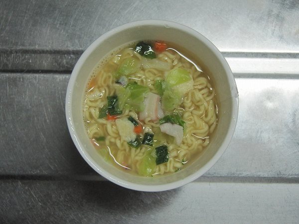 お湯を入れて3分、蓋を開けてよくかき混ぜれば完成。シーフードの香りがまあまあしてくるとともに、彩り豊かな具材が現れたのでお値段以上の期待感が出ました。