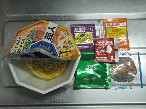 お湯を入れて5分、蓋を開けて粉末スープと液体スープを入れてよくかき混ぜてから、最後にイセエビ粉末を入れて軽くかき混ぜれば完成。イセエビの良い香りがします。