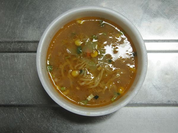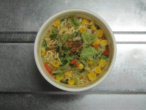 お湯を入れて5分、蓋を開けて粉末スープと液体スープを入れてよくかき混ぜれば完成。芳醇だと解る味噌の良い香りがしてくるとともに野菜の甘そうな香りもしました。