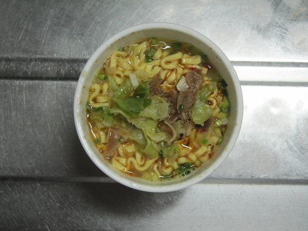 お湯を入れて5分、蓋を開けて麺をよくほぐしてから粉末スープを入れてよくかき混ぜ、最後に液体スープを入れてさらにかき混ぜれば完成。味噌の良い風味がしますね。