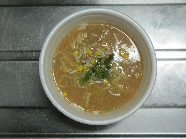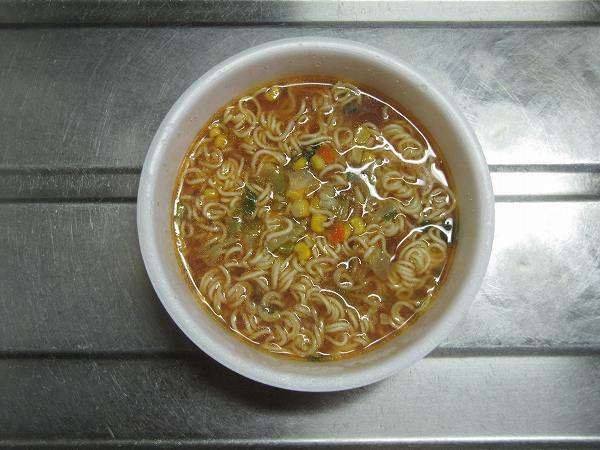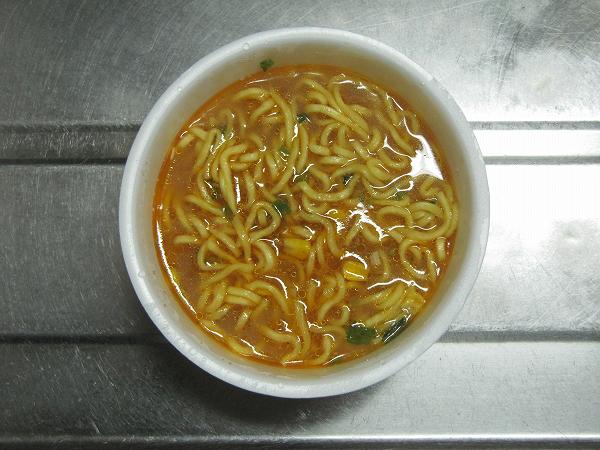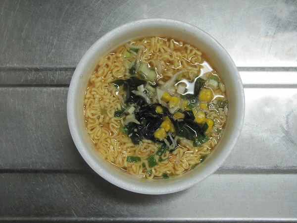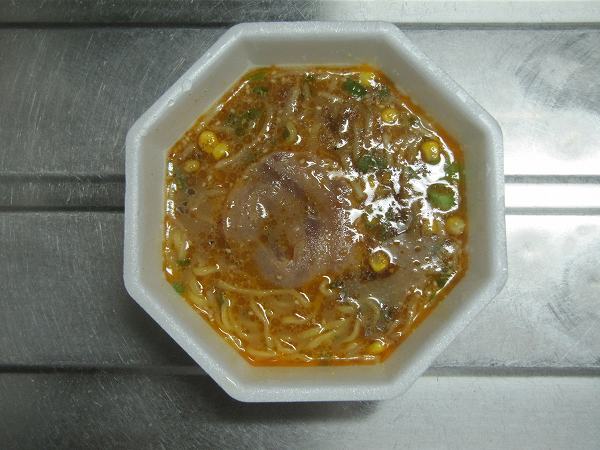 お湯を入れて3分、蓋を開けてよくかき混ぜれば完成。懐かしい即席味噌ラーメンの香りのようなものに加えて甘そうな香りもしてくるといった仕上がりになってます。