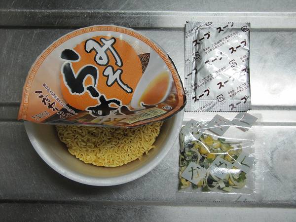お湯を入れて3分、蓋を開けてよくかき混ぜれば完成。味噌の風味というより何か薬の臭いといった感じで、カップ麺のみそ味が誕生した初期の頃を思いだしました。