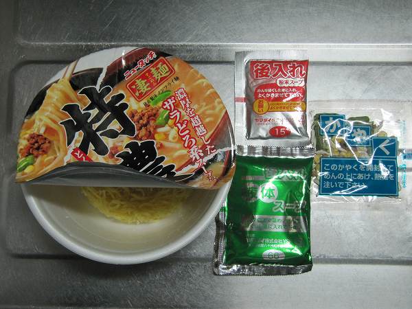 お湯を入れて5分、蓋を開けて特製スープを入れ、先に入れてある粉末スープもすべて溶けきるまでしっかりとかき混ぜてから、最後にレトルト具材を乗せれば完成です。