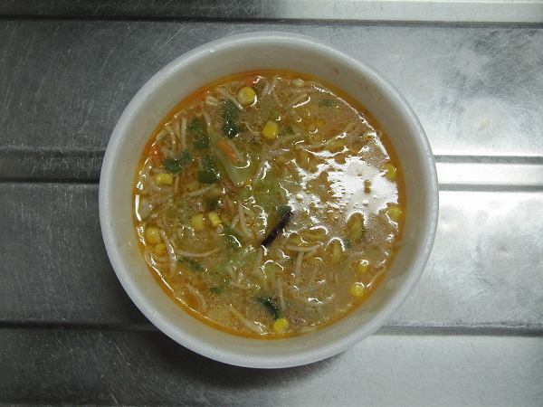 具は豚肉、キャベツ、コーン、ニンジン、長ネギの5種類。豚肉は少ししか入っていないのが寂しく、一方でキャベツはタップリと入っているので食感を堪能できます。