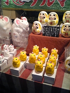 年末になると「暮れ市」が立つ、僕の地元。今日はうちの近所で露店が連なっていました。ネズミの形のだるまさんまで?子供が小さい頃は、家族そろって練り歩いたものですが……いまや、それぞれに予定があるらしく、一緒に歩きたい人も違う、とかね。先輩と飲みに出て、刺身の代わりに出た、最高に美味いマグロのカマを食べたりピアノのあるパブで、音楽談義をしたり♪先輩は市民吹奏楽団にも所属していて、音楽をこよなく愛し続ける一人なのです。「音楽は良いよ~」が、口癖な先輩。 いつも若い♪タクシーで帰路、途中で友人二人から呼び出しがあって「飲みに来ないか?」と。同時刻に二人から「着信アリ」彼ら二人は小学校~中学校が同級だったらしく、たまたま暮れ市で会って意気投合?僕は片方と高校でバレーをしたし、もう一人とは複雑な縁で、今はゴルフのライバル。バレーで燃えた高校時代~実業団チームに入って責任を背負ってプレーした彼。毎年、40歳以上のチーム構成で戦う「マスターズ」の全国大会に行くらしい。「いつまで続けられるかわからないけれど、とりあえず来年も頑張るよ。」と。一方、東海大で原辰則とホットコーナーを獲り合い、人気の差で1塁に追われた彼。今では原君もシングルハンディ、彼も大洗GCの<6>です。(それってすごいよ)「70歳になっても、ゴルフはやっていたいよね」と。三人とも熱い。まだまだ50歳過ぎには見えませんって、、絶対。夢を追い続けている人は、若い。 力がみなぎっている。そんな、夢追い人たちと、一緒に歩める僕も幸せなのではないかしら?僕の夢?それはね。。。 ひ み つ