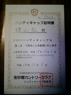 最近よく競技に出かけている金砂郷CCからはがきが届きました。9月と11月に71&70というスコアをだしたのが評価されてハンディキャップの変更がありました。”4”から”3”に。ここよりコースレートが低い美野里で大叩きをした次の日に届いたはがきの数字。信じていいのかしら? と言う感じで眺めていました。昨夜も痛飲。水戸での宴会の後、大工町という繁華街で飲んでいたら、中学のときの友人と会う。運命的な偶然によって、35年ぶりの再開でした。久しぶりに男とハグしました。話す内容も風貌も変わってはいない彼に、まじめな話を持ちかけたらまじめに答えが返ってきました。素晴らしい再開に、乾杯! 乾杯! 乾杯!・・・・・今朝は二日酔い。