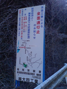 激坂で有名な八王子の山奥の和田峠ですが、法面工事の為、明日から通行止めになります。(期間:2/2~3月下旬)ただし、平日の昼間(午前8時~午後5時)だけですが・・・。行こうと思っているサイクリストの方、気をつけてください。看板には、藤野側と書いてありますが、もう一枚看板があって、八王子側もダメです。
