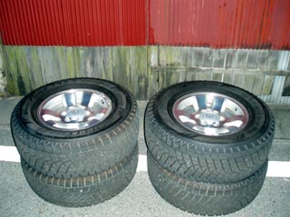 昨日某HP管理人さんよりボートエギング中に電話があり、「ケンクマさんスタッドレスいかがっすか~」との事。中古美品アルミホイール付き現行モデルと言うことで、しかもあり得ないスーパーお値打ち価格!!と言うわけで早速今日取引先(某管理人さんではないです)の所で見せてもらい、速攻ゲッチューして参りました。ブリザック DM-Z3と言うモデルです。タイヤも磨り減っていないし、かな~り程度良いです。前の車の時にはスタッドレス持っていたのですが、現在はハイラックスサーフと言うこともあり、タイヤが異常にデカイ=値段が高いと言うことで持って無かったのです。そこで最初から付いていたタイヤの溝が無くなった時に、オールテレンのデューラーA/T694に交換しました。少々の雪でしたらこれで十分なのですが、ツルツル圧雪ですともう大変!!今年の3月に南湖へ向かう途中、関ヶ原~沖ノ島付近の道路が圧雪モード!!滑りまくりで本当に泣きそうになりました。後ろを走っていたネバサマガイドのたつきちさんが滑っている姿を見て、思いっきり車間距離を空けたくらいですから(苦笑)そんな感じでオールテレンの方も3万キロ位(?)走ったので、大分磨り減ってきました。今年は絶対買わなイカンなぁ~と思っていたところに、とても良い話が来たので速攻食いついたわけです。これで冬の湖北も安心していけるし、最近目覚め初めたショートスキーに行くにも助かります。でも過信はダメなので、雪道は慎重に運転しないと行けないですね!!