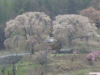 今日は暑かったですね~。と言いつつケンクマは避暑地である南アルプスに行っていました。(仕事で・泣)それでもこの時期の南アルプスとしては異常に気温が高く、途中の道路の気温計が23℃となっていました。途中の中央道はいつもよりかなり車が多かったです。やたら東名で事故渋滞やら、故障車有り等皆さんGWのドライブは気を付けてくださいね~。南アルプスへ行く途中に桜で有名な高遠があり、開花時期には大渋滞で時間にゆとりを持って移動していたのですが、城址公園は既に葉桜で、残念やらほっとしたやら。しかしもう一つの名所、勝間のしだれ桜は丁度満開でした。小さい写真でしか見せれないのが残念ですが、本当見とれる位綺麗でしたよ~。それと伊那谷は昼前から夕方前までいたのですが、強風吹いていました。天気は良かったのですが、黄砂かフェーン現象か???南アルプス、中央アルプスとも霞んで見えました。しかし今年は春の訪れが遅かったせいか、まだまだ雪がしっかりあります。そう言えばこの前の野尻も、麓のスキー場はまだまだ滑れそうでした。そんなこんなで今年度も南アルプスには仕事で足を運びそうです。