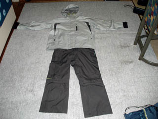 今日は昨日の日記で書いた通り、家でゴロゴロ。予告していた内容を実施してました。1.HDDレコーダーに貯まったワールドカップ予選の鑑賞。2試合見ました~。2.エギングロッドのグリップ改造。グリップを外すのが意外に大変でした。EVAグリップがまた剥がすのが途中で、飾りの金具も接着がしっかりし過ぎて途中で嫌になって終わりました(笑)3.この前買った魚探の振動子破損対策用金具の加工。現地で実際見てから加工する事に。4.フットボールジグの製作。ここまで手が回りませんでした。野尻行き出す前には作りたいんですけどね。5.サーフ君の洗車。昼前後にスコール降ってやる気無くなる(爆)6.頼まれたサッカーのDVDを焼き焼き。今ブログ書きながら焼いてます。7.近くの野池でバス釣り。もちろん行ってません(爆)と言った感じだした。今日ついに前にも書いていた勤続記念のお金でついにゴアテックスのレインウエア買いました。取り寄せを頼んでいたのですが、今日夕方ルアーショップおおのさんから連絡有り、取りに行ってきました。何だか死体検証現場みたいですね(笑)ダイワの新ブランドアクオリアのゴアテックスレインウエアAQR-1211J(上)とAQR-1311P(下)です。ソルトウォーターのブランドでデタッチャブルと言って、袖と裾が外れて夏場に使う時は涼しくていいです。ゴアテックス3レイヤーなので撥水、透湿にも優れていてしかも軽いです。上と下は別売りで、上はウエーディング用に短いタイプもあります。この別売りと言うことを利用して上は服を厚着する事も考慮してLサイズ、下はMサイズにしました。パンツの方はウエストがヤバイかな~と思っていましたが、最近のプールが効いたか?そんなにキツクも無く、膝を曲げてもそんなに張る事もありませんでした。ゆとりがあった方がいいと思うんですが、Lサイズだと裾が長過ぎて足の短い僕は引きずる事になるからです(笑)前のレインウエアはLサイズでウエストも緩すぎてすぐ下がってくるし、裾も引きずっていました。前のもデタッチャブルだったんですが、ただの撥水、透湿加工のものでしたので、すぐ蒸れるので不快きわまりなかったです。しかも先週の釣行では染み込んで中までベタベタでした(泣)前のウエアは予備用にするつもりです。アクオリアはデザインも機能も気に入りましたが、フードが収納できないのはちょいと不満です。バスボートに乗っているとフードはパラシュートになって首が絞まるので(泣)とりあえず明日は晴天予報ですが、朝の冷えるうちは上だけ着てみようと思ってます。